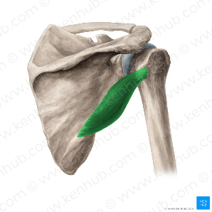 - Origin and insertion: Originates posteriorly on the scapula, close to the scapula’s lateral border, and inserts on the greater tubercle of the humeral head.