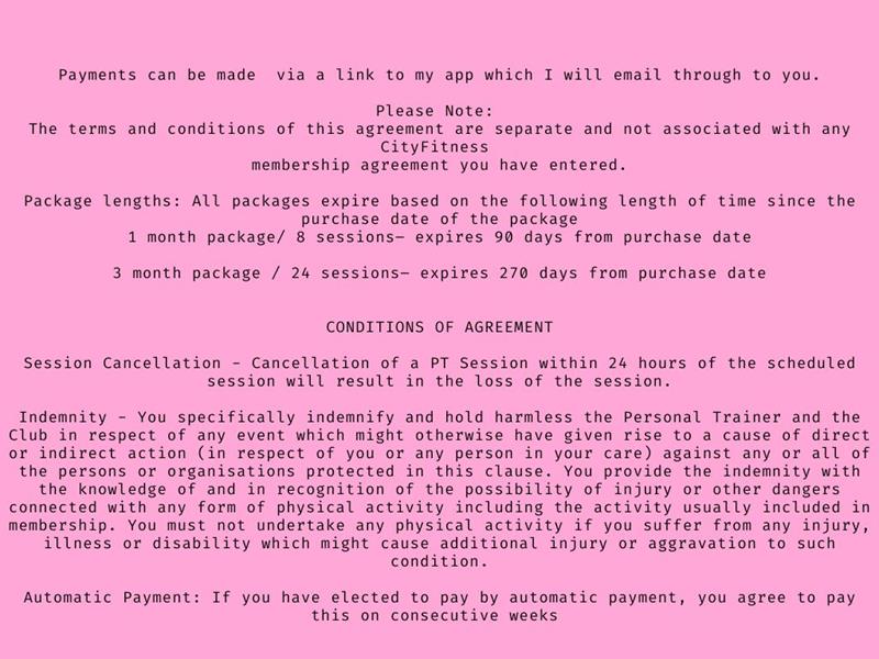 8 x 30 minute personal training sessions to use across a month. @ $35 per session paid upfront lump sum.