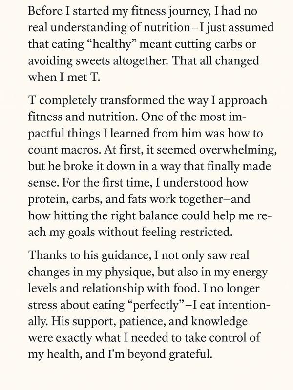 -Weekly video check-ins (30 min) -Mobile app access (in-app messaging) -Weekly nutrition guidance with caloric and macro review -Strength training program with flexibility and mobility programming -Monthly progress checks