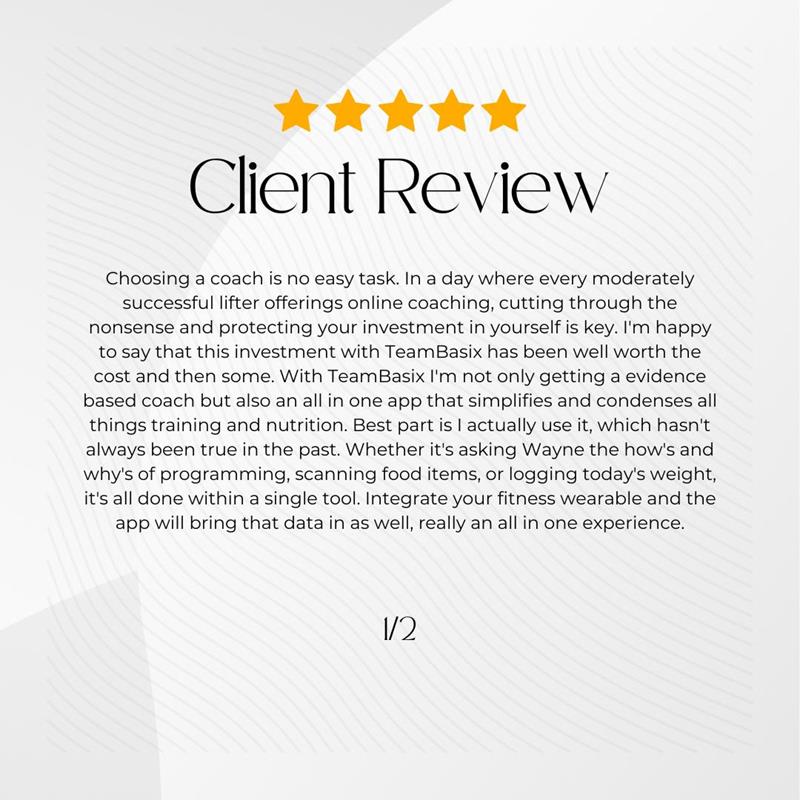 Introducing our comprehensive Online Coaching program, designed to help you achieve your health and fitness goals. Our program is designed and led by a highly qualified coach, who holds multiple certifications including M.S. in Exercise Science with a concentration in strength & conditioning, TSAC-F, Exercise is medicine credential, and Certified Strength and Conditioning Specialist. He utilizes research and evidence-based practice to ensure that you receive the best possible guidance and support. Our personalized approach is tailored to your individual needs and goals, with access to our full food library and coaching app, whether you're looking to improve your general fitness, gain muscle and strength, increase flexibility, or rehabilitate from an injury. We offer a wide range of services, including women's fitness for pre-peri- and postnatal women, nutrition and meal plans, bodybuilding, strength sports, teams sports and competition prep, weight loss, endurance training, and more. We prioritize self-efficacy and education in our coaching philosophy. We believe that by educating you on proper form, exercise science, and nutrition, we can empower you to take control of your health and fitness journey for the long term. Our approach ensures that you not only reach your short-term goals but also develop the knowledge and skills needed to maintain your progress for a lifetime. With TEAM BASIX, you will also you'll receive constant guidance, support, and motivation to help you stay on track and achieve your goals. Our remote training program includes weekly updates and 7 days a week communication with your coach, who will be with you every step of the way.