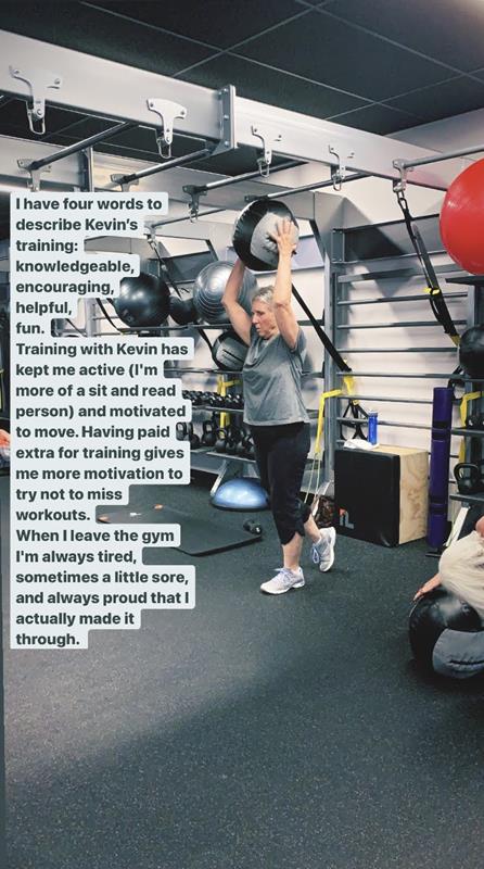 Training with Kevin has kept me active (I'm more of a sit and read person) and motivated to move. Having paid extra for training gives me more motivation to try not to miss workouts.