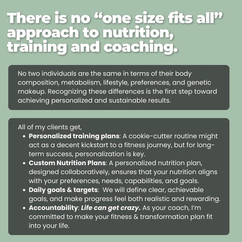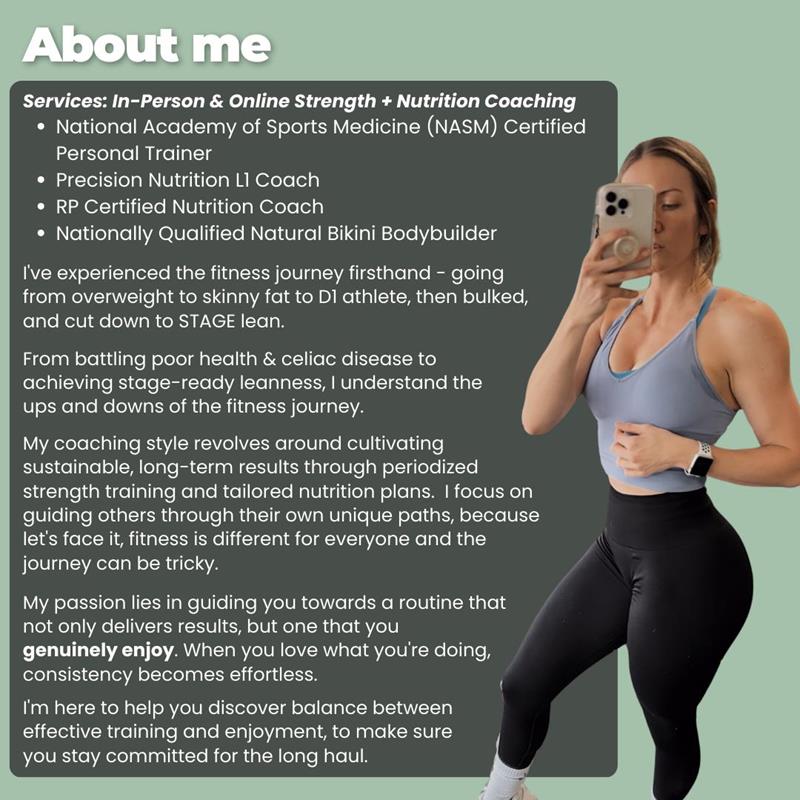 I help clients build strong bodies, become confident in and outside of the gym, and gain control of their nutrition to see life-changing results. I believe movement and exercise should be fun - It's different for everyone and my goal is to build a program you're excited to work on.