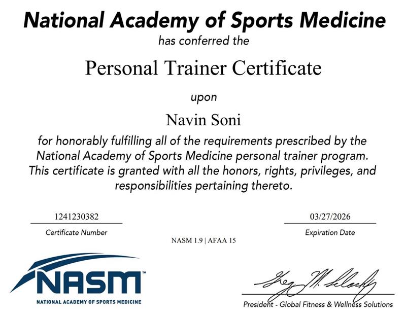 As a Certified Personal Trainer through the National Academy of Sports Medicine (NASM), Navin brings expert knowledge and a passion for fitness to every client interaction.